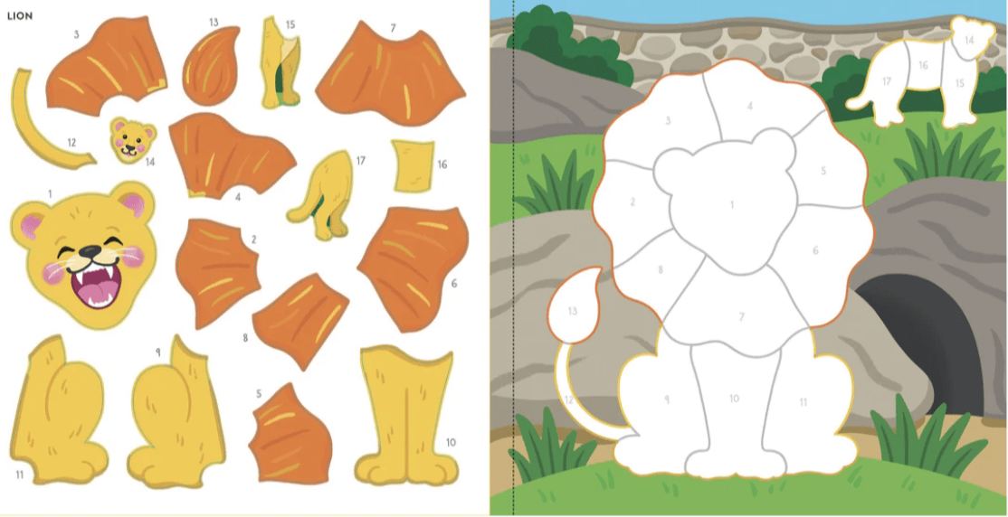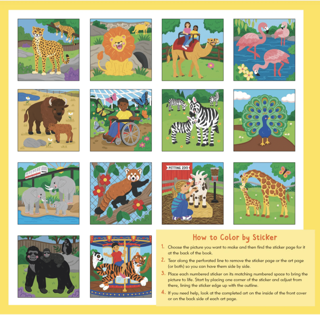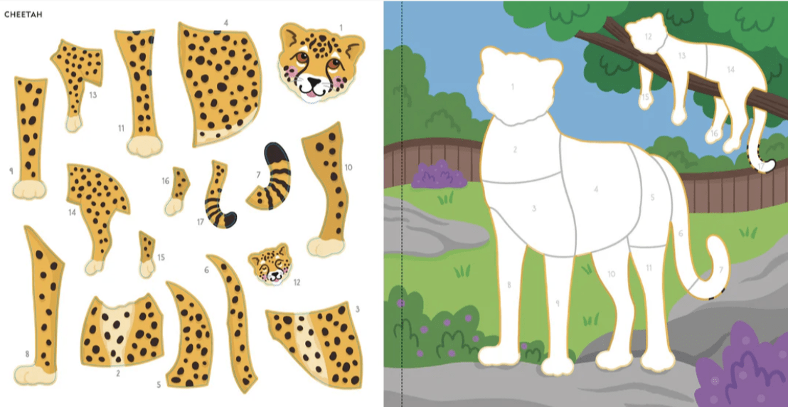 - Little ones simply place numbered stickers on the matching numbers in each scene, to reveal a cheetah, a camel ride, a peacock, and more!