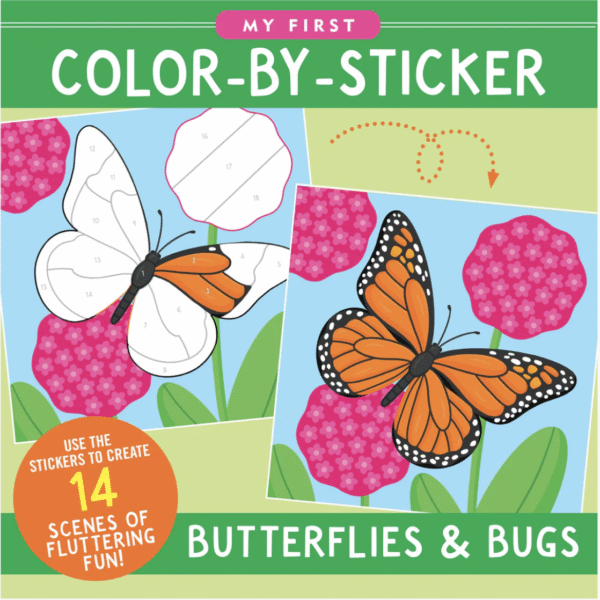 - Sticker book comes with 14 scenes of favorite butterflies and bugs to ”color” with the stickers provided.