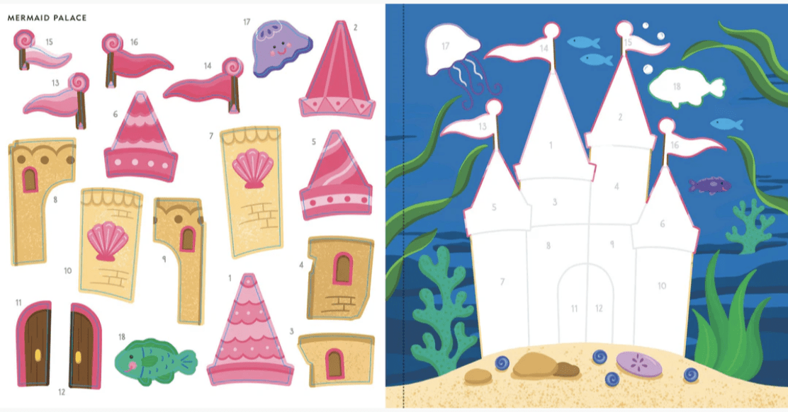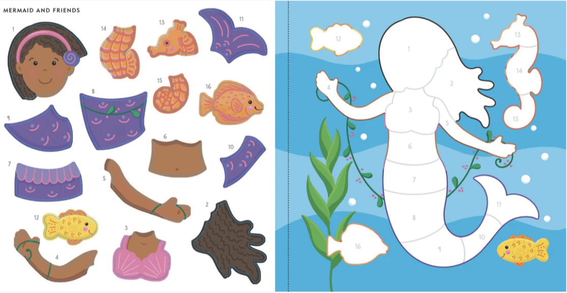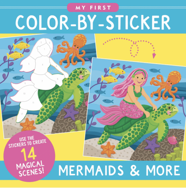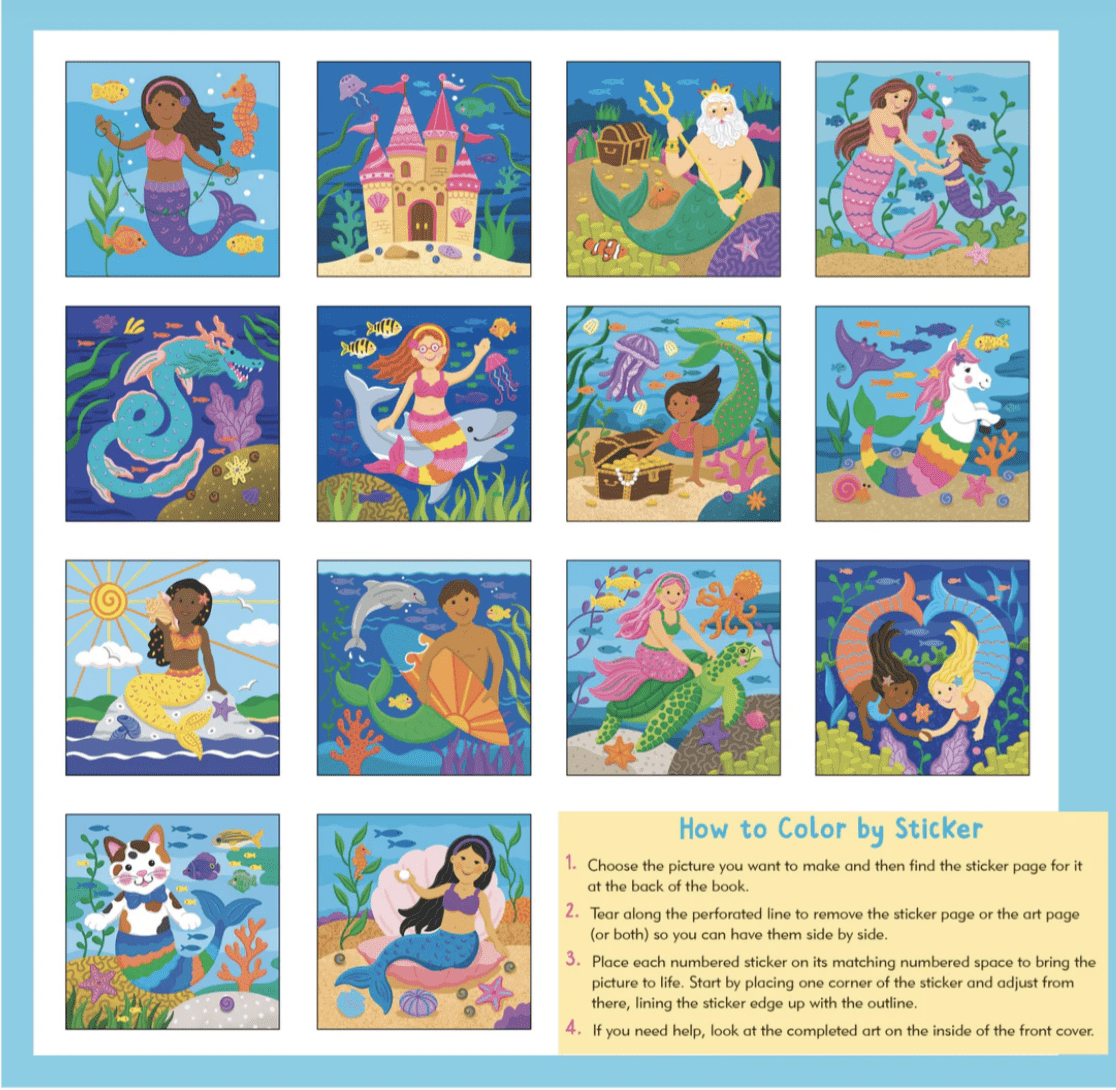 • Sticker book comes with 14 mermaid-themed scenes to ”color” with the stickers provided.