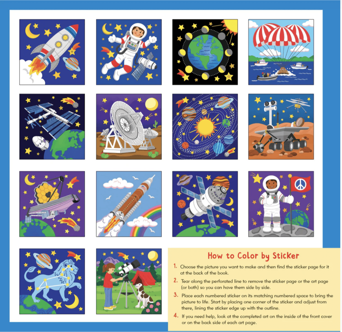 • Fun sticker book comes with 14 out-of-this-world scenes to ”color” with the stickers provided.