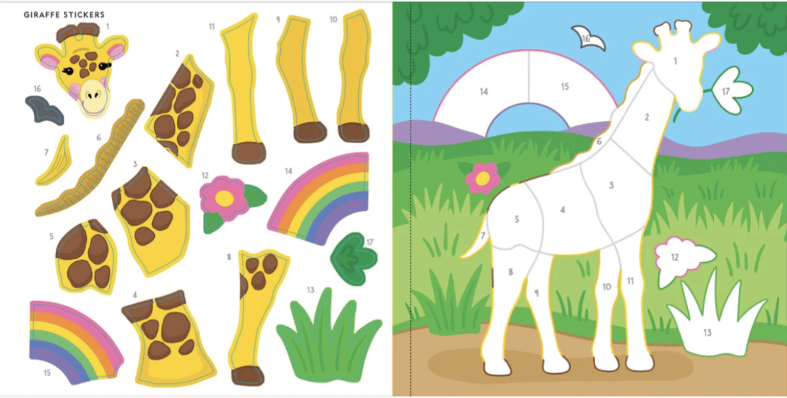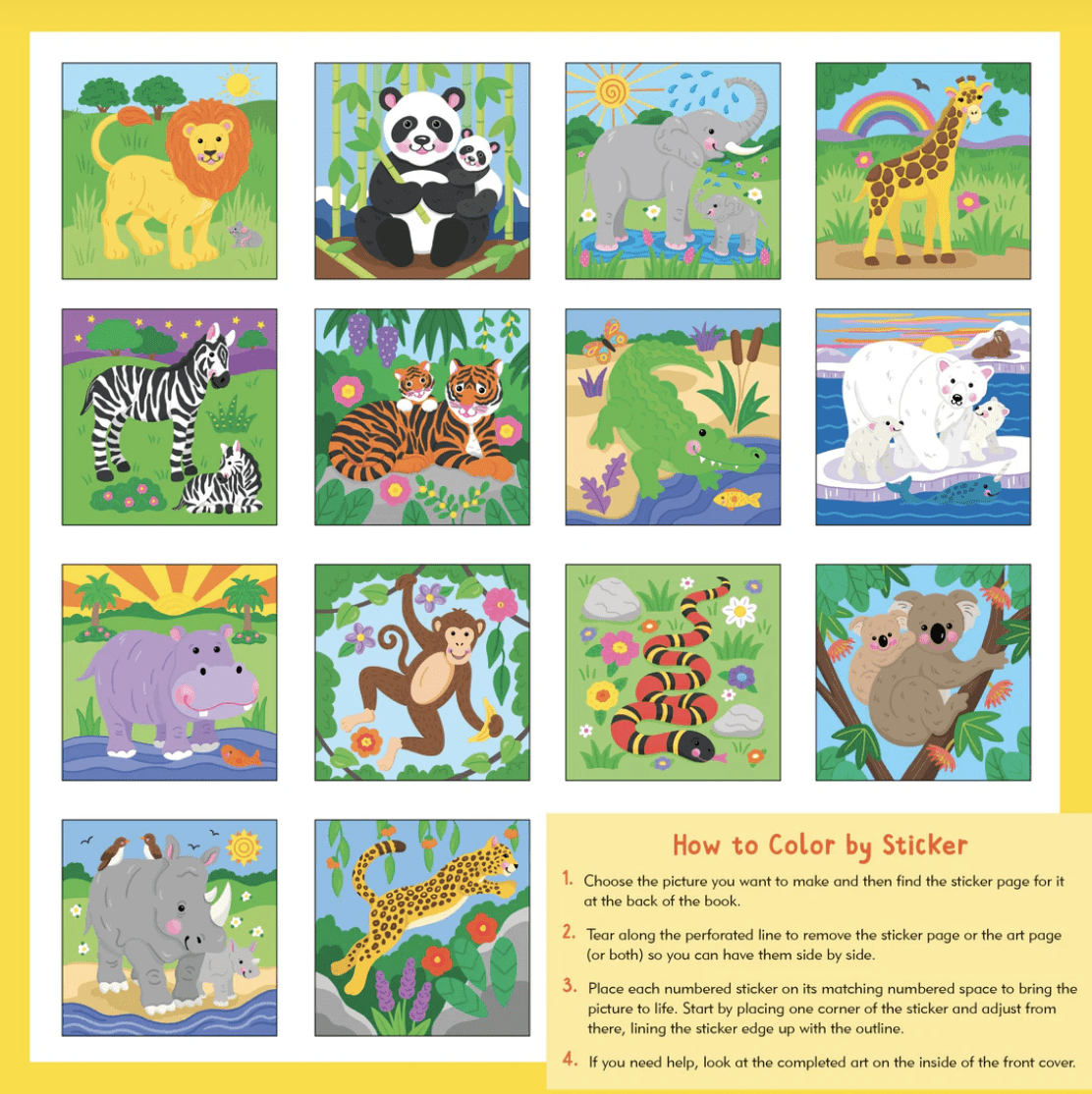 • Sticker book comes with 14 scenes of favorite animals to ”color” with the stickers provided.