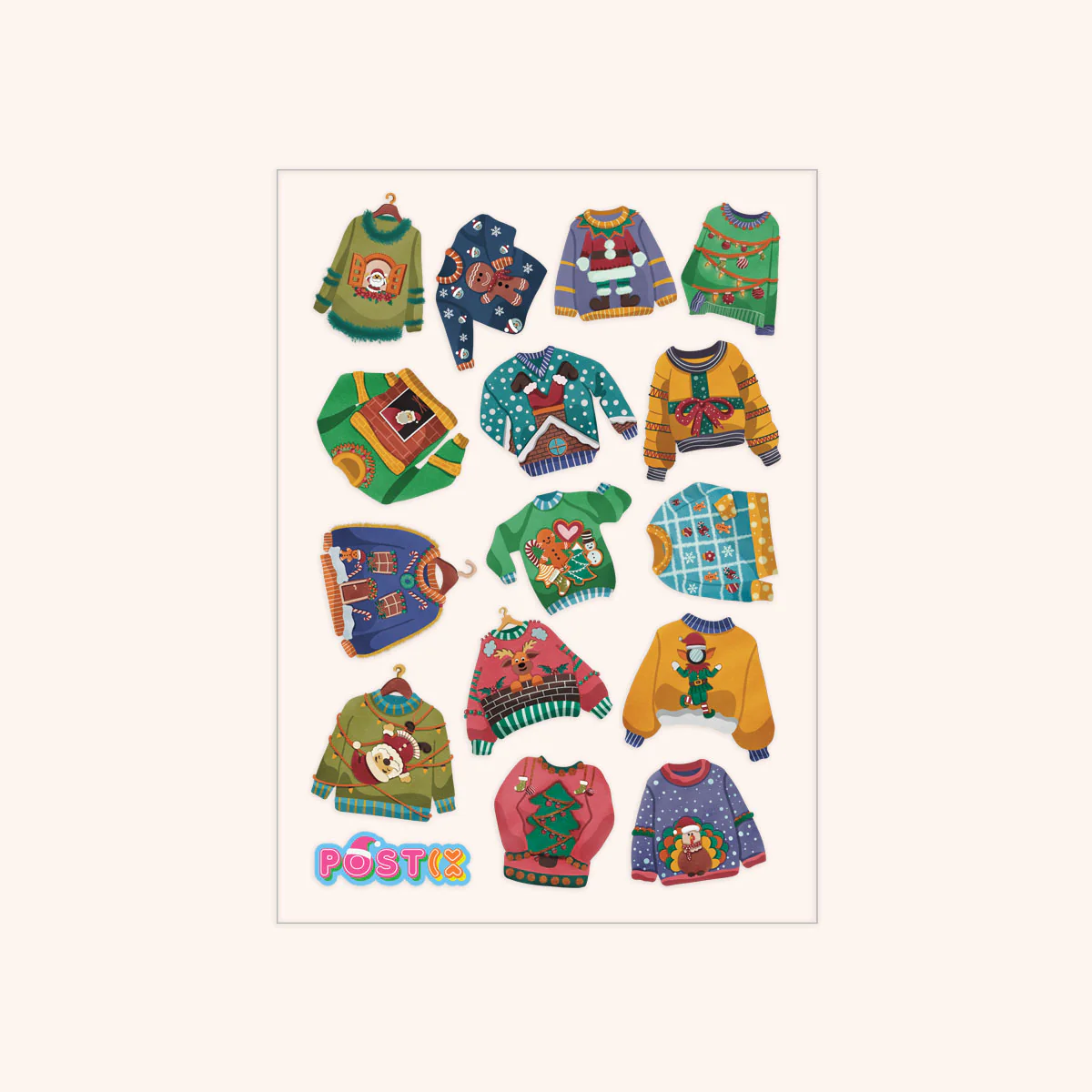 Featuring delightfully tacky yet irresistibly charming Christmas sweaters, including designs with turkeys, elves, Santa, gingerbread men, and more, this sheet is packed with festive humor.
