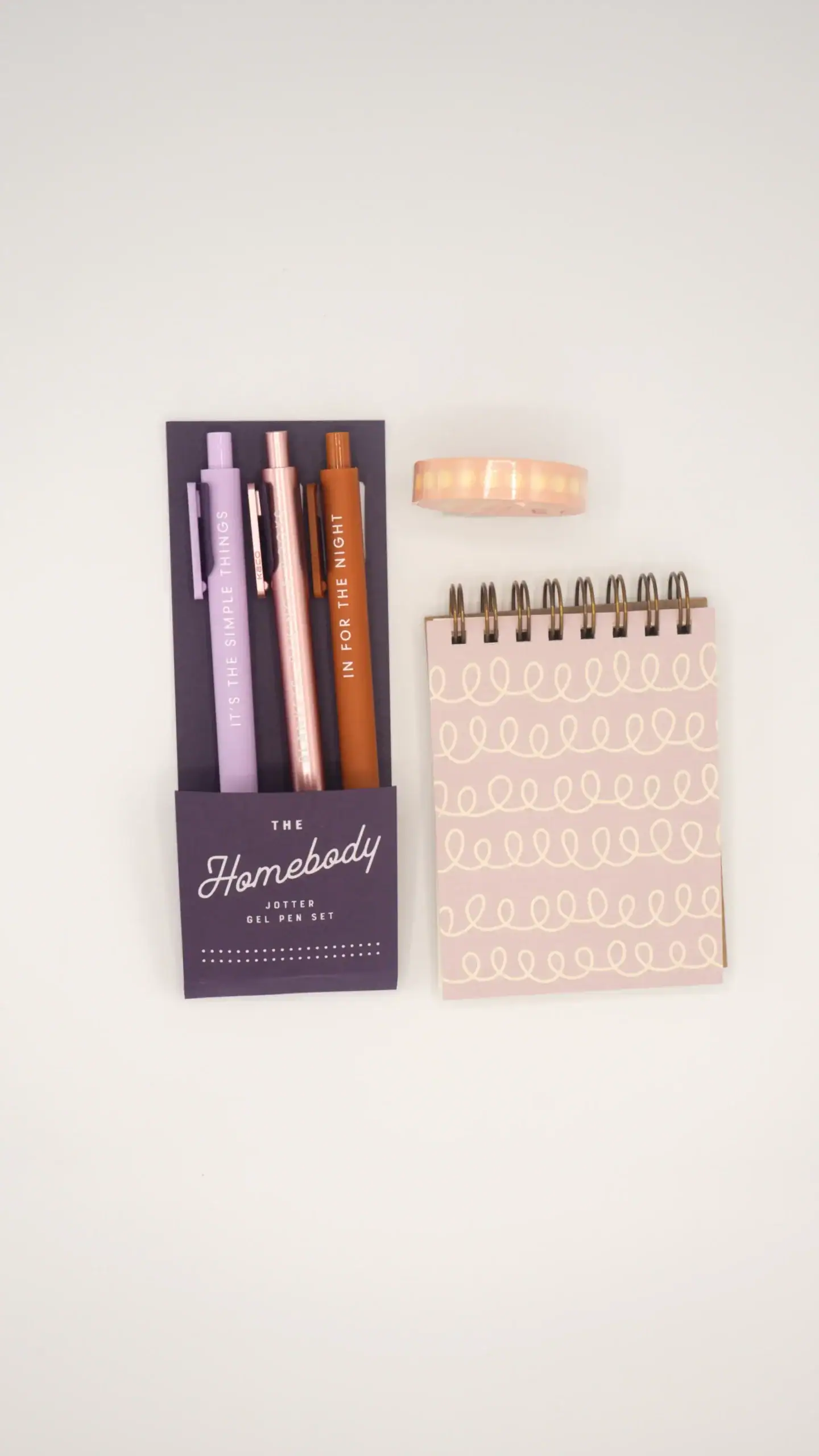 “The Jotter Set” is the perfect set for on the go! The small and convenient notepad fits perfect in your purse, along with 3 different gel pens that write beautifully! The washi tape adds a great touch to your notepad, and if you want to add any photos!