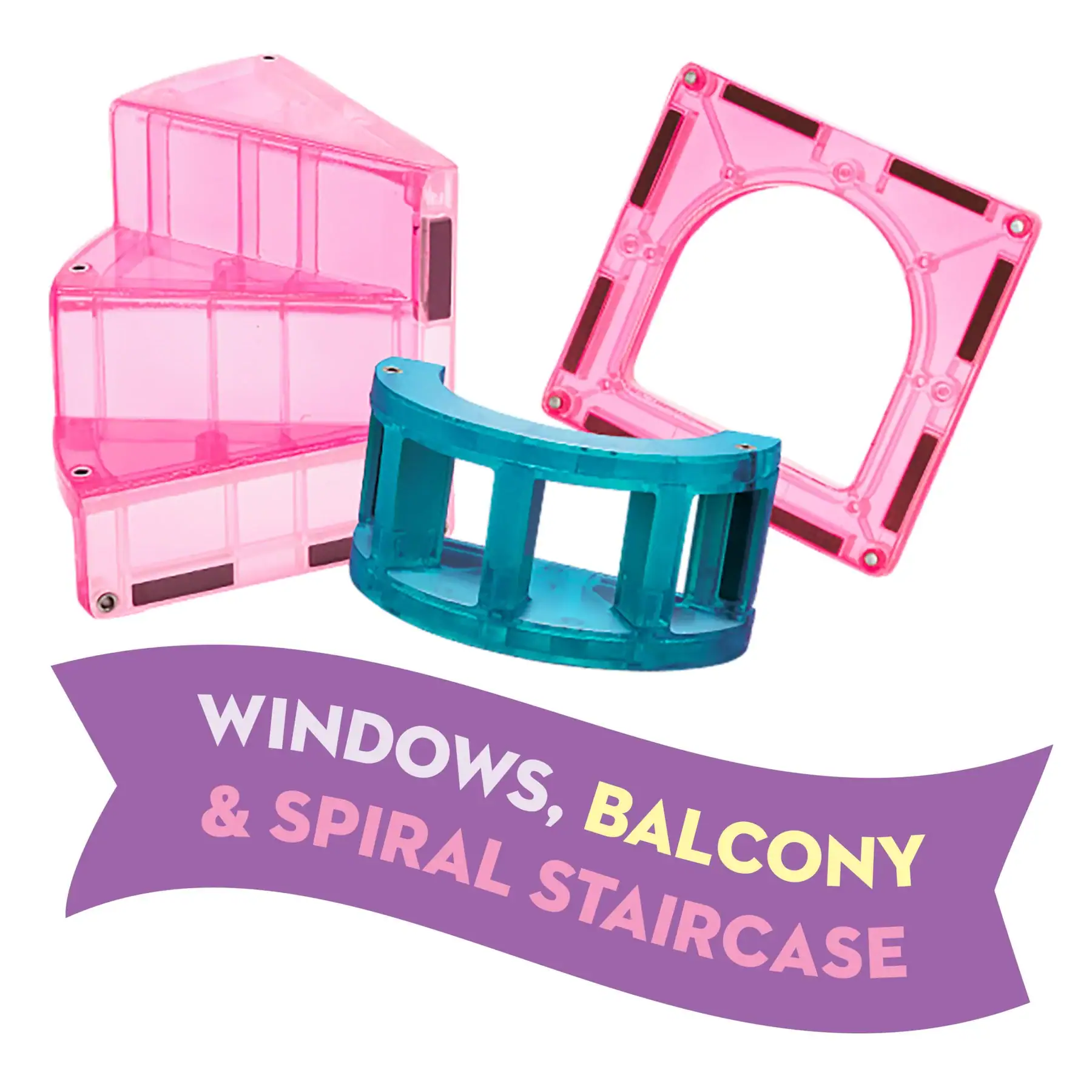 Dreams come true with the MAGNA-TILES Castle set!  Open the working Drawbridge and step into a world of magnetic wonder or soar through the skies with an exclusive Dragon Figure.  This set also includes our first Balcony and Spiral Staircase, along with a sprinkle of Glitter tiles for a little enchantmentWatch as children create their own fairy tale adventures with the unlimited storytelling potential and construction fun found in MAGNA-TILES Castle.